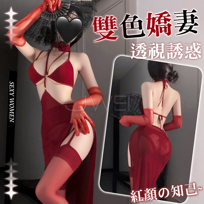 雙色嬌妻.迷迭花樣掛脖頸環美背側高衩網紗睡裙-紅【頸環+連身裙+內褲】