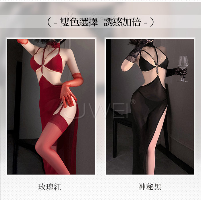 雙色嬌妻.迷迭花樣掛脖頸環美背側高衩網紗睡裙-紅【頸環+連身裙+內褲】