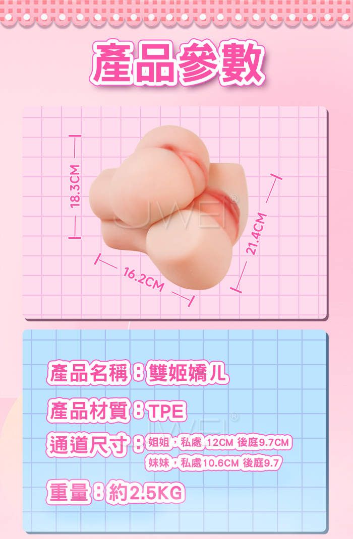 雙姬嬌儿,禁忌の雙子幻想~一體雙享 次元雙生,雙姬合體,解鎖你の獨佔物語!! 4通道玩法多樣,慢玩纏綿+刺激衝刺,妹:緊縮螺紋+仿貞膜;姐:大波浪+吸吮顆粒 擬真肌膚材質,觸碰真實軟妹,清爽觸感 不易出油,你就是這場物語の唯一男主角!! 產品規格 ■尺寸:大小詳如圖片標示 ■材質:TPE ■重量:約2.5kg ■特點:四通道、小陰落紅