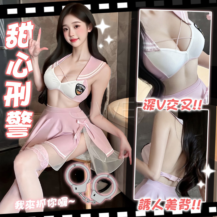 甜心刑警.胸前交叉繫帶清純百褶透視白紗COS制服套裝【上衣+短裙-粉+白】