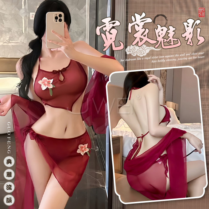 霓裳魅影.薄紗透視美背繫帶古風舞姬肚兜套裝【肚兜+短裙+披肩-棗紅】