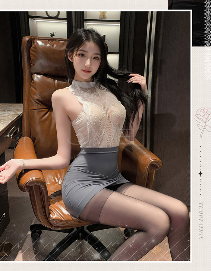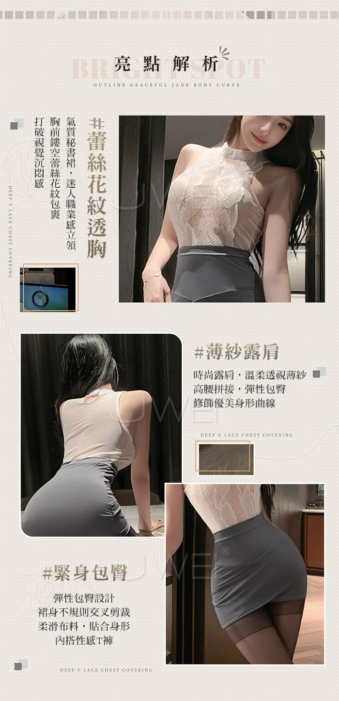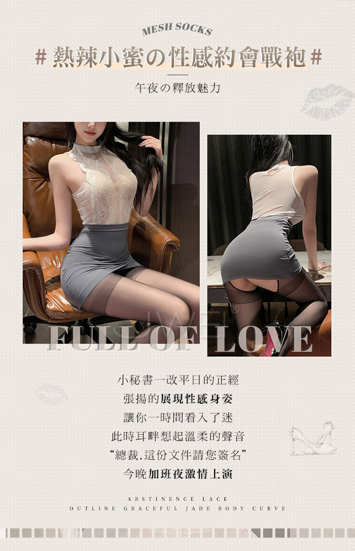 首頁>熱辣小蜜.禁欲蕾絲花紋透胸緊身包臀秘書套裝-灰色【包臀連身裙+T褲】
