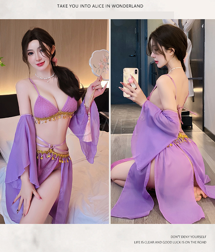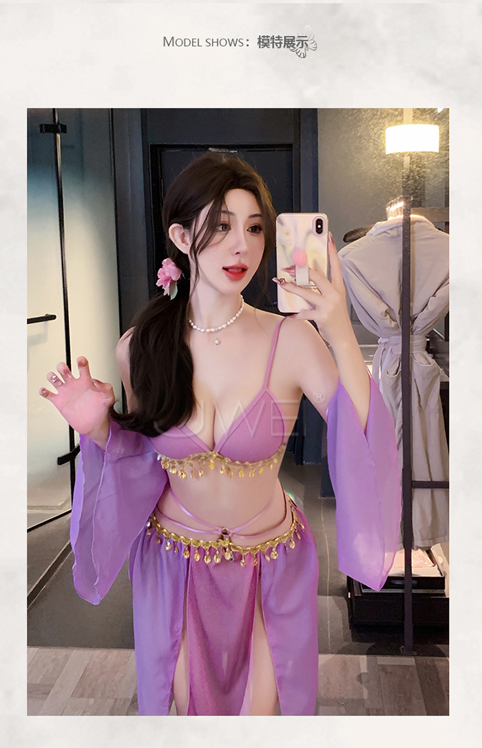 情定西域.異域風情復古亮片拼接裙擺角色扮演服-紫色【胸罩+短裙+T褲+袖子*2】
