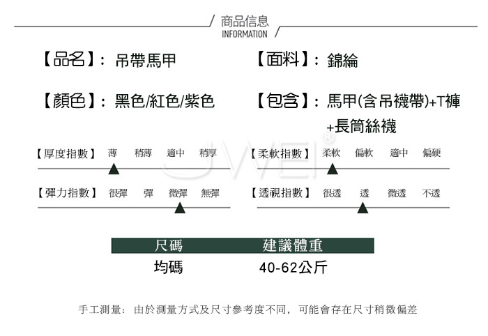 ■內容物:馬甲(含吊襪帶)+T褲+長筒絲襪 ■適穿尺寸:FREESIZE ■彈性:有 ■未撐開平量尺寸正負誤差1~2cm,1吋=2.54cm ■注意事項:基於保障消費者個人衛生,此貼身衣物恕不接受退換貨。 (如為商品本身暇疵,接受七日內換貨,請勿試穿,謝謝您)
