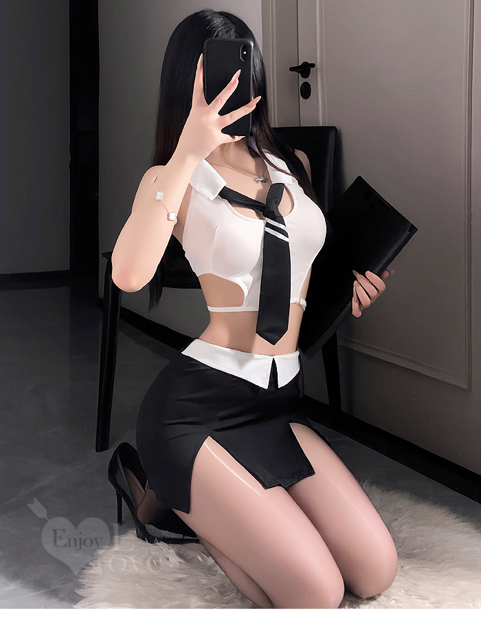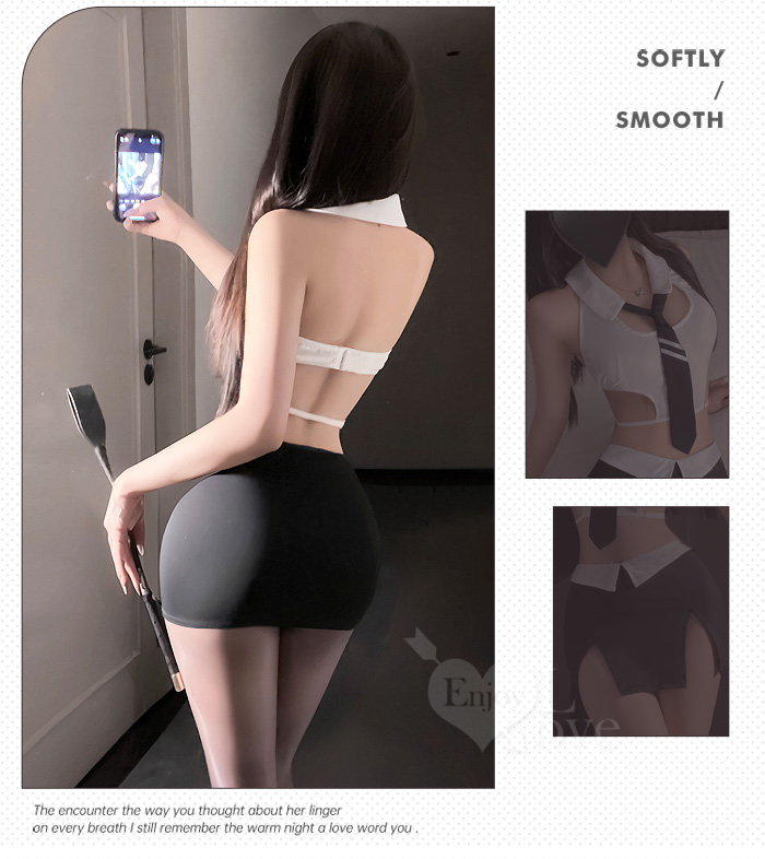 ►您現在的位置:首頁>秘書角色扮演服!細帶露腰短上衣撞色雙開衩包臀裙四件式套裝