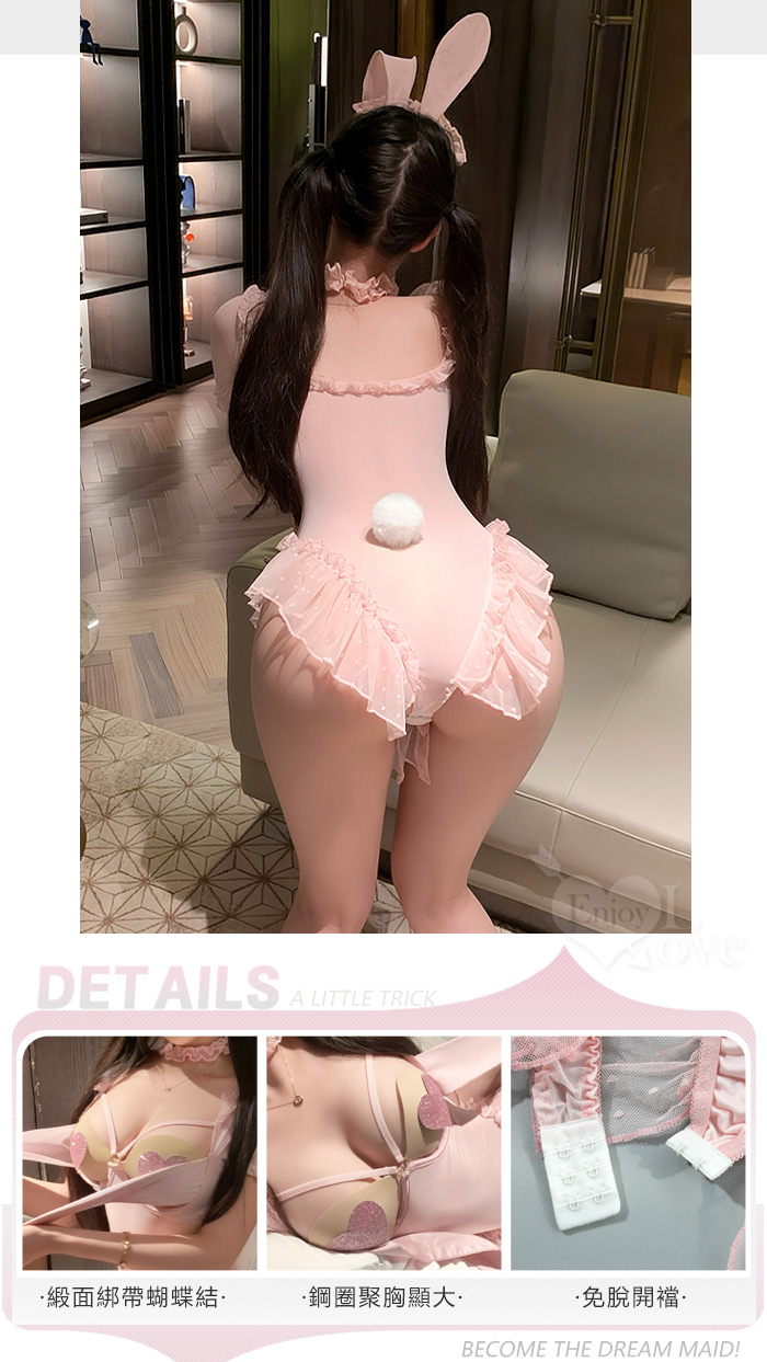 兔女郎角色扮演服!鋼圈托乳蝴蝶結高衩波點蕾絲開襠連身衣三件組