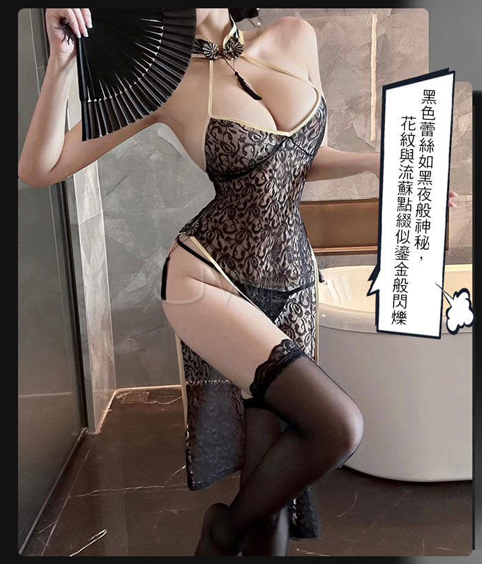 | 墨染鎏金.性感純欲蕾絲花紋低胸開衩美背旗袍【旗袍+T褲】