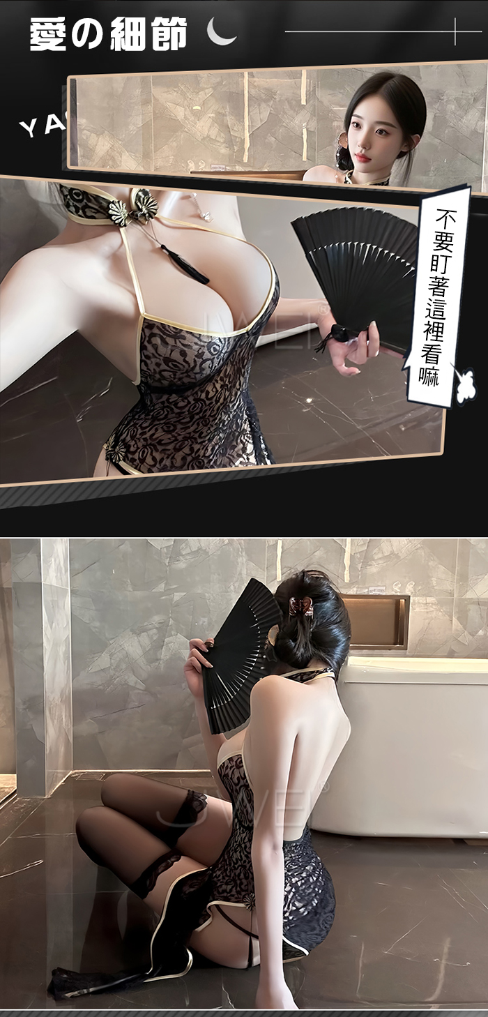 ►您現在的位置:首頁>墨染鎏金.性感純欲蕾絲花紋低胸開衩美背旗袍【旗袍+T褲】