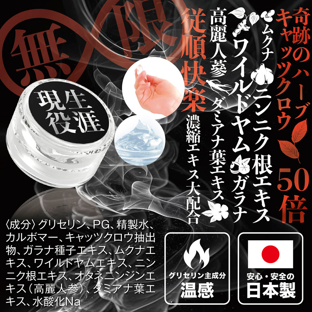 成分:甘油、丙二醇、純水、卡波姆、貓爪藤萃取物、瓜拿納種子萃取物、黧豆萃取物、野山藥萃取物、大蒜根萃取物、高麗人參萃取物、達米阿那葉萃取物、氫氧化鈉